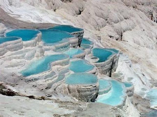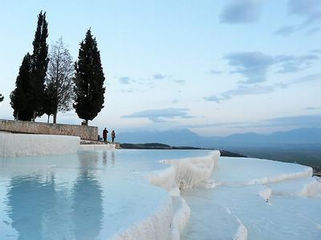 库萨达斯KUSADASI—帕姆卡莱PAMUKKALE 早餐之后,乘车前往帕姆卡莱,前往参观土耳其著名温泉度假区 - 棉花堡(游览约30分钟).棉花堡的地下温泉水不断从地底涌出,含有丰富矿物质如石灰等,经过长年累月,石灰质聚结而形成棉花状之岩石,层层叠叠,构成自然壮观的岩石群和水池。您可在泉水内畅游或享受泉水涌出的天然水力按摩,据说有治疗高血压,风湿症和皮肤病的效用。之后游览希拉波利斯古城(约40分钟)。此城在公元2世纪-3世是古罗马的温泉中心,曾经一片繁荣。该地景点是世界自然文化双遗产,内有世界上唯一拥有露天钟乳石及石化地形的自然奇观:浅绿色的温泉水流过白色的石灰岩,造成一窟窟阶梯式排列的洁白温泉池。远望犹如层层梯田,却又洁白如雪。 注:库萨达斯-帕姆卡莱车程约4小时 | ||
